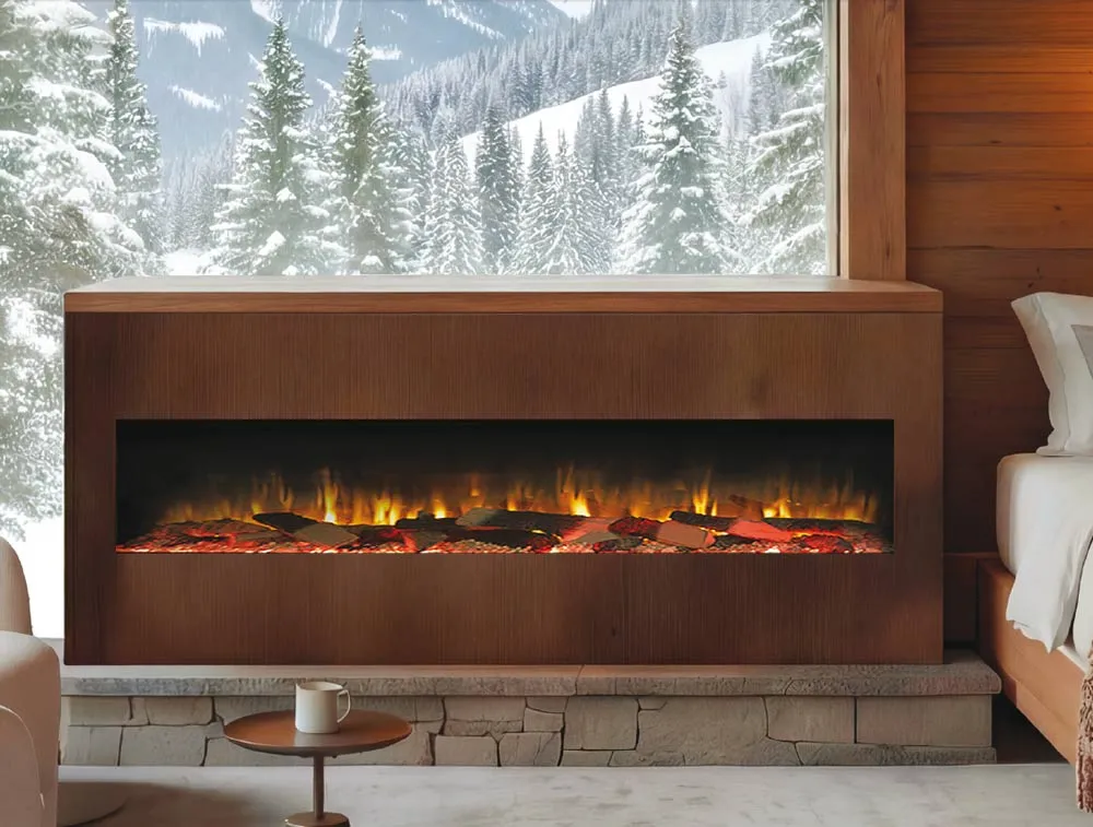 LIT DE COMBUSTIBLE Avec un ensemble de bûches haute définition mixtes et interchangeables : bois brûlé, cristaux et matériau granulaire.